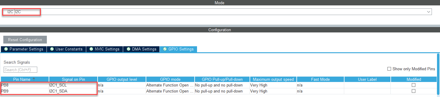 4. Perform the following configurations to enable and configure I2C1 to enable the communication between host and target as shown in STM32 CubeMX.