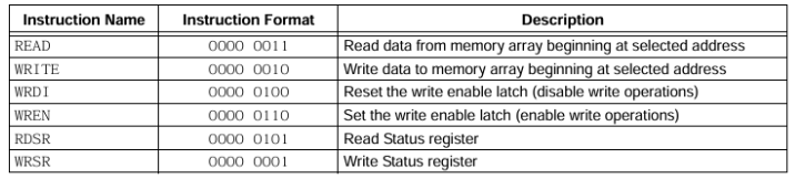 This table, from the Microchip 25XX080 8K SPI Bus Serial EEPROM datasheet, shows the module instruction set.