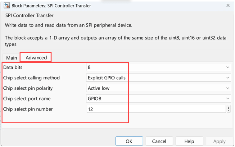 Open the SPI Controller Transfer block from the spiEEPROMWithControllerTransferBlock.slx example model. Configure the SPI module as shown below (SPI2 in this example):