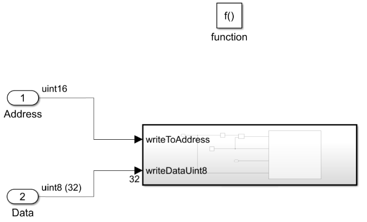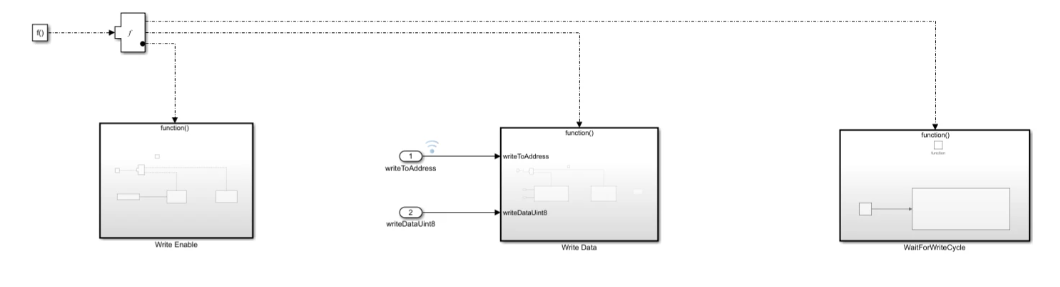 The write operation uses three function-call subsystems: Write Enable, Write Data, and Wait for Write Cycle.