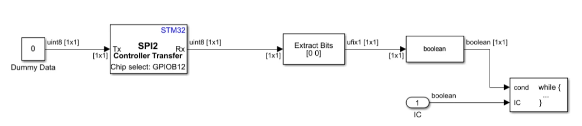 This example shows how to use Serial Peripheral Interface (SPI) blocks provided in the STM32 Microcontroller Blockset to interface between an SPI bus and a Microchip 25XX080 8K SPI Bus Serial EEPROM. This EEPROM is organized as a 1024×8-bit (1024 bytes) memory device with a 16-byte page size.The example explains EEPROM module concepts and covers how to: