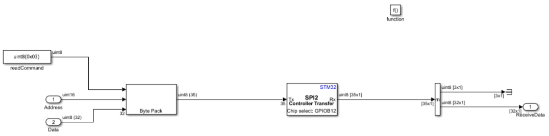 This example shows how to use the SPI Transmit and SPI Receive blocks to read and write data to an SPI EEPROM (25AA080) on STM32 processor-based boards when transmit and receive operations occur at different rates or require independent control. The blocks allow separate management of chip select timing and data length, with buffered interrupt mode handling transfers larger than the SPI FIFO depth.