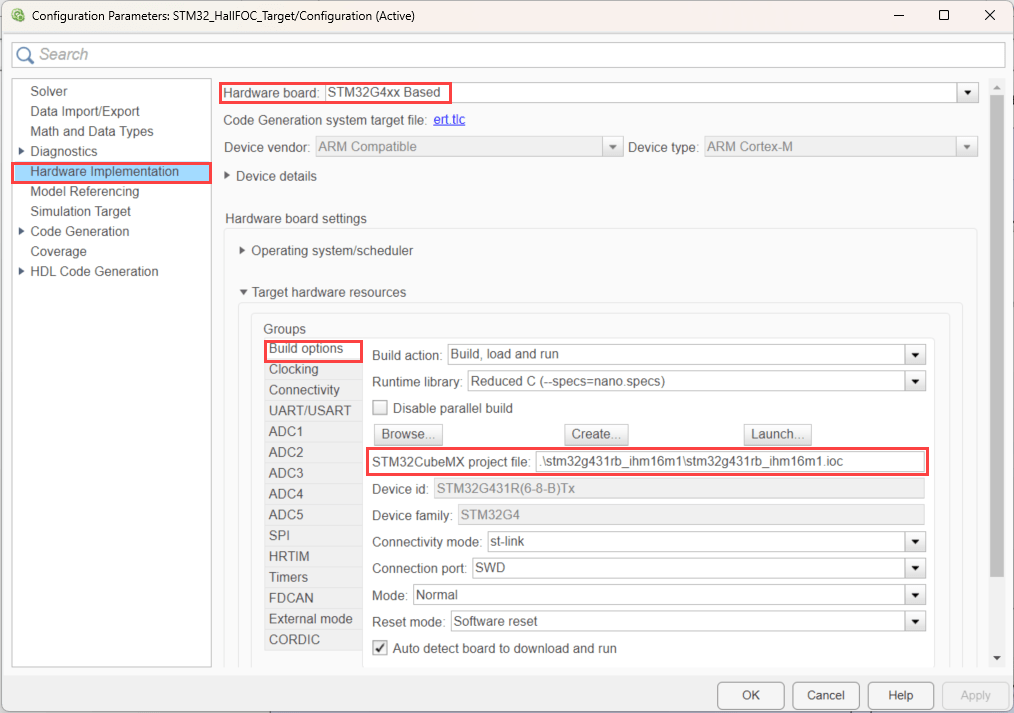 1. Open the STM32_HallFOC_Target model. This model is configured for STM32G4 xx Based hardware.