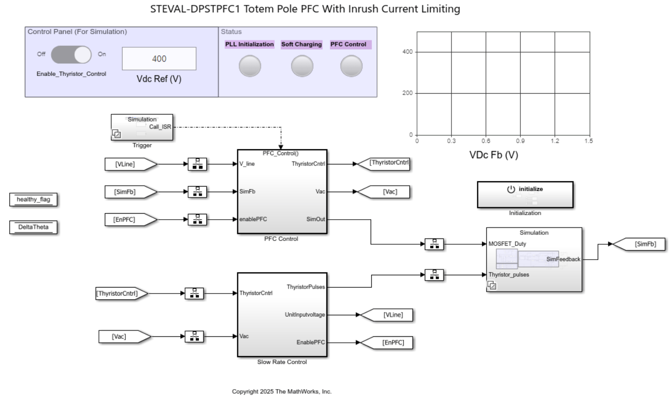 This example shows how to model, simulate, and deploy a digital control algorithm for a totem-pole power factor correction (PFC) converter with an inrush current limiter (ICL).