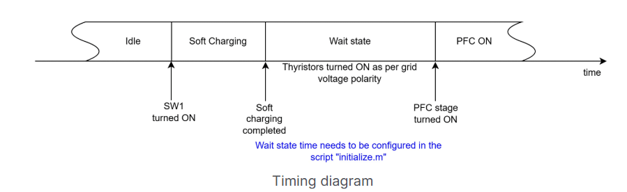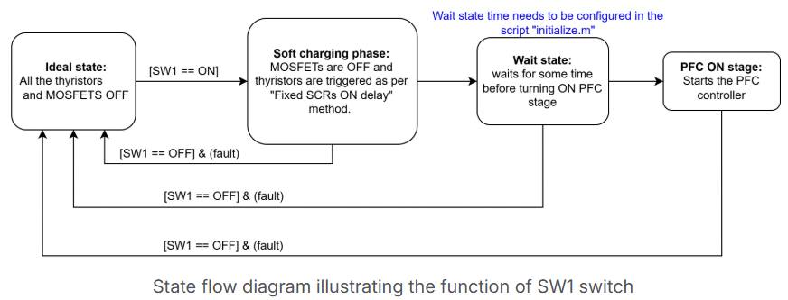 4. Set SW1 = 1 to initiate the startup sequence. This action triggers the soft-charging stage followed by activation of the PFC control loop.