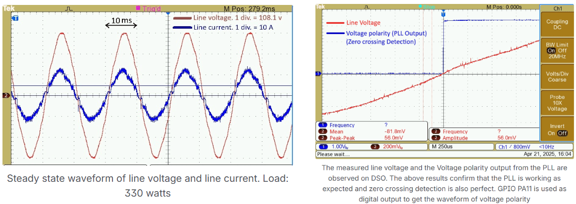 Next, observe the AC line voltage and line current simultaneously. The line current waveform should be sinusoidal and closely aligned with the line voltage, demonstrating near-unity power factor operation. This behavior confirms that the PFC control algorithm is shaping the input current correctly.