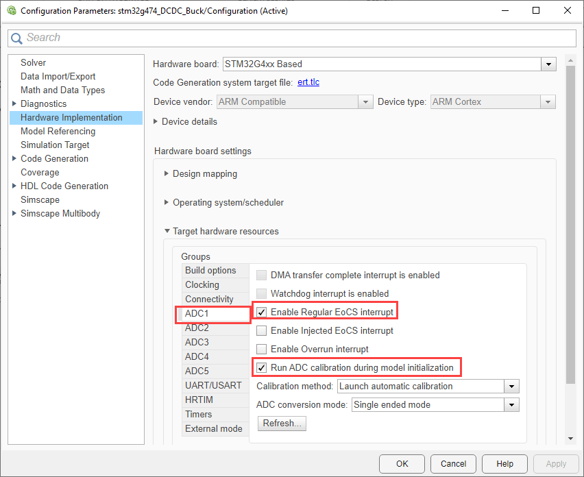 Set the peripheral block configurations for this model. Double-click the blocks to open block parameter configurations. You can use the same parameter values if you want to run this example on other hardware boards. The following configuration are shown for Buck converter model. You can perform the similar configurations for Boost Converter stm32g474_DCDC_Boost.slx model.