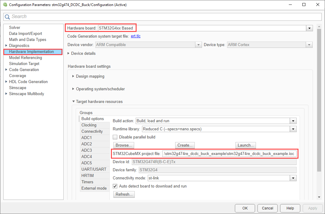 Repeat the same steps for the stm32g474_DCDC_Boost.slx model and select the stm32g474re_dcdc_boost_example.ioc in the Model Configuration.