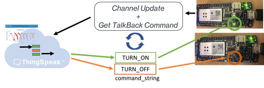 此示例显示如何更新您的通道并从 ThingSpeak™ TalkBack 队列中获取命令。使用命令来改变板载 LED 的状态。