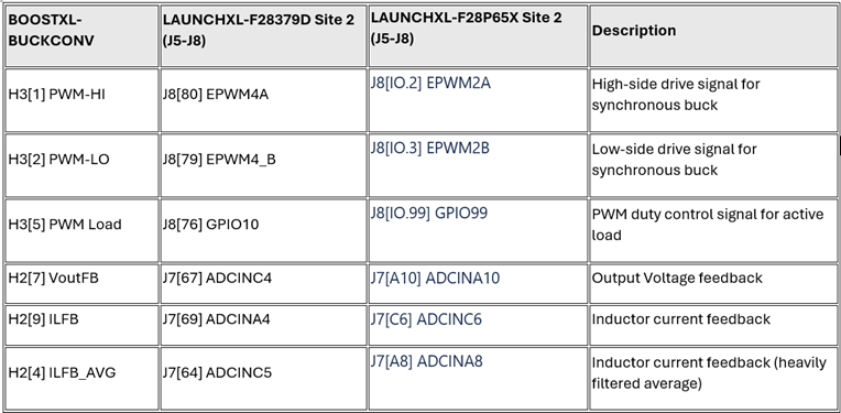 按照下表中的详细说明,将数字电源降压转换器 BoosterPack (BOOSTXL-BUCKCONV) 连接到 Texas Instruments Delfino F28379D LaunchPad 或 Texas Instruments F28P650D LaunchPad。