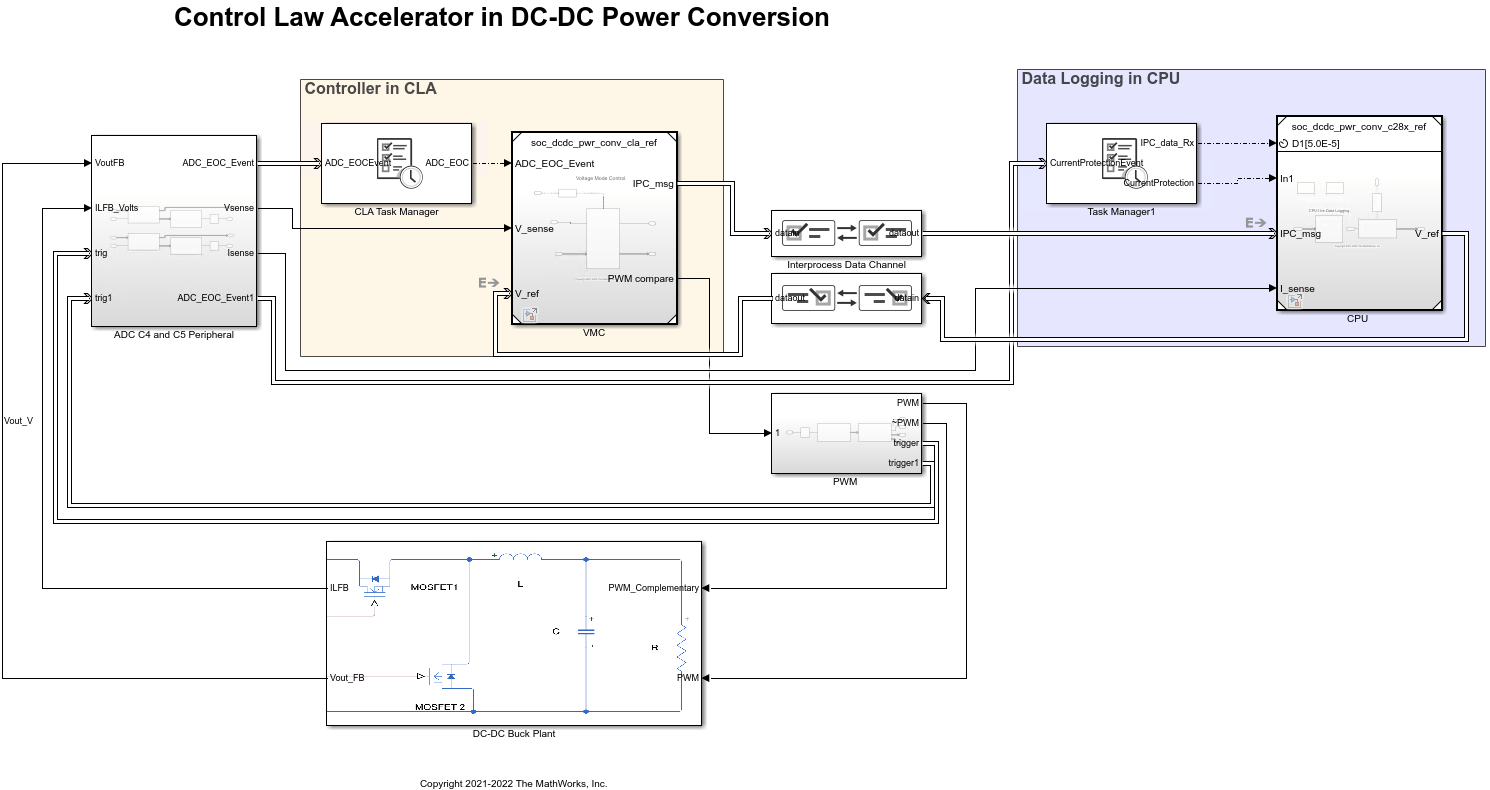 该模型展示了在 CLA 上执行电压模式控制 (VMC) 算法的 DC-DC 电源转换系统。该模型为 CLA 和 C2000 CPU 参考模型分配了一个单独的 Task Manager (SoC Blockset) 模块。有关 CLA 上任务调度的更多信息,请参阅 CLA 任务管理器文档。打开模型。