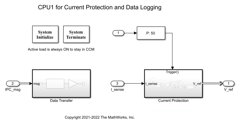 C2000 CPU 将电压参考信号发送到 CLA,并接收和记录电流和电压反馈值。Interprocess Data Channel (SoC Blockset)模块模拟 CLA 和 C2000 CPU 之间的数据交换。当部署到硬件时,这些模块利用共享内存的一部分在 CLA 和 C2000 CPU 之间进行数据传输,并确保数据完整性。