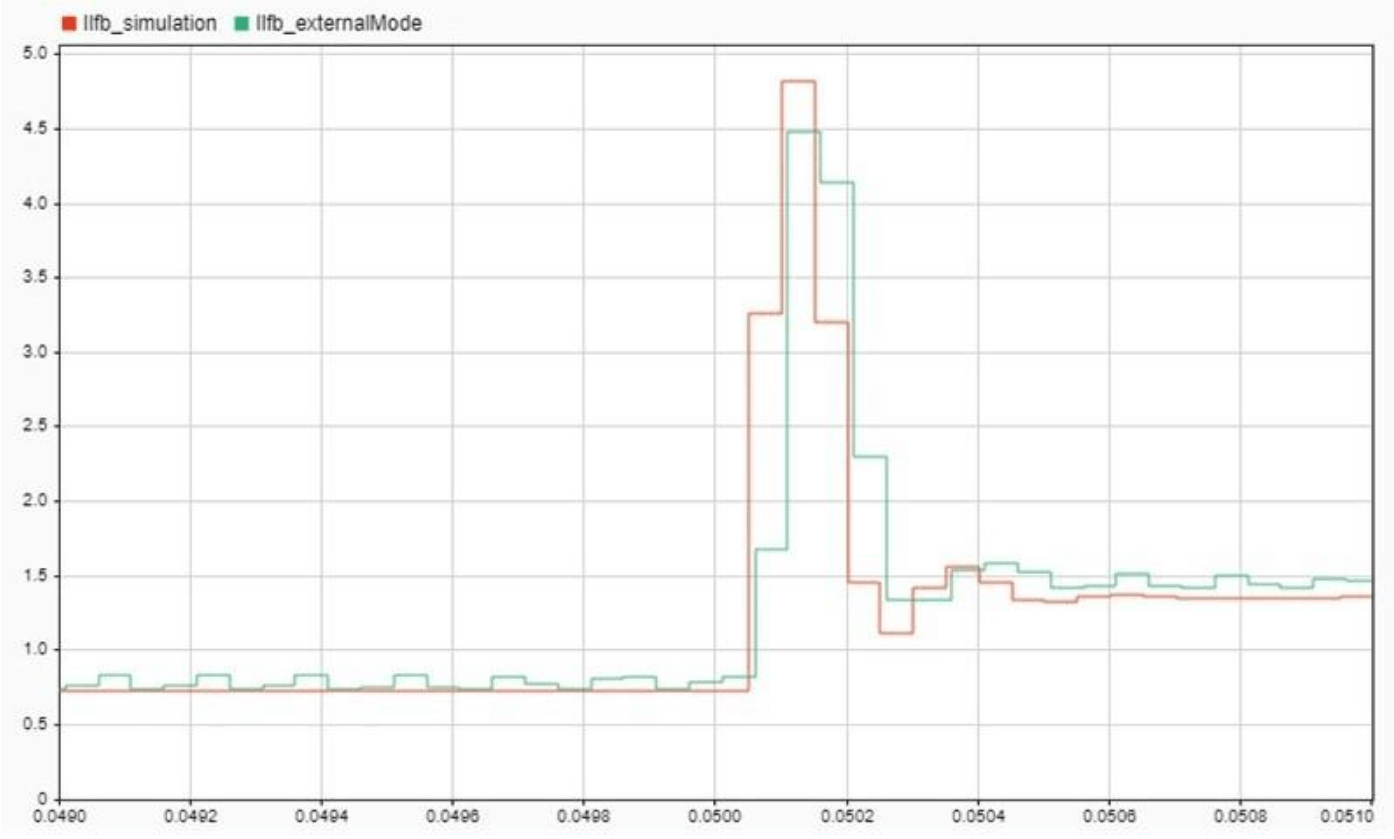 下图显示了从 0 伏到 2 伏的阶跃响应。电压模式控制器能够正确跟踪所需的参考电压。电流低于阈值,算法继续运行,不会中断。还可以观察到,外部模式的结果与仿真模式下获得的输出结果一致。
