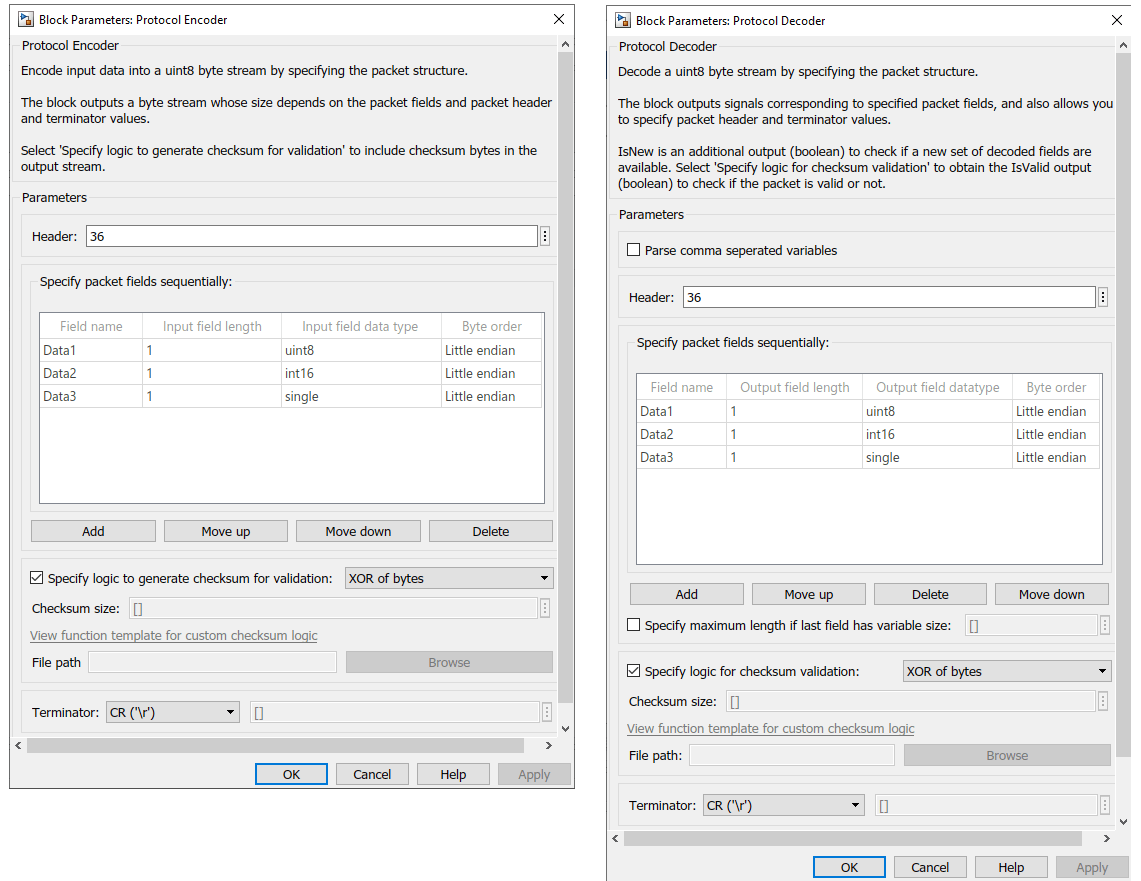 在接收端,使用 C28x SCI Receive 模块接收字节流,并使用 Protocol Decoder 模块解码成各个字段。SCI Receive 模块的状态输出指示有新数据可用,用于触发包含 Protocol Decoder 模块的已启用子系统。
