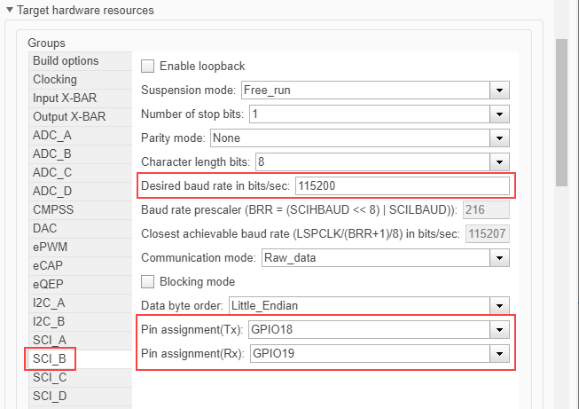 5.在 Target Hardware Resources 下,点击 SCI_B 选项卡并配置属性,包括波特率和引脚分配。