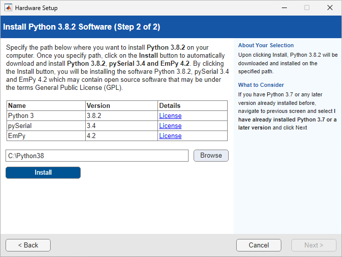 This section helps you complete the Install Python 3.8.2 Software step of the Hardware Setup process (using the Hardware Setup screens).