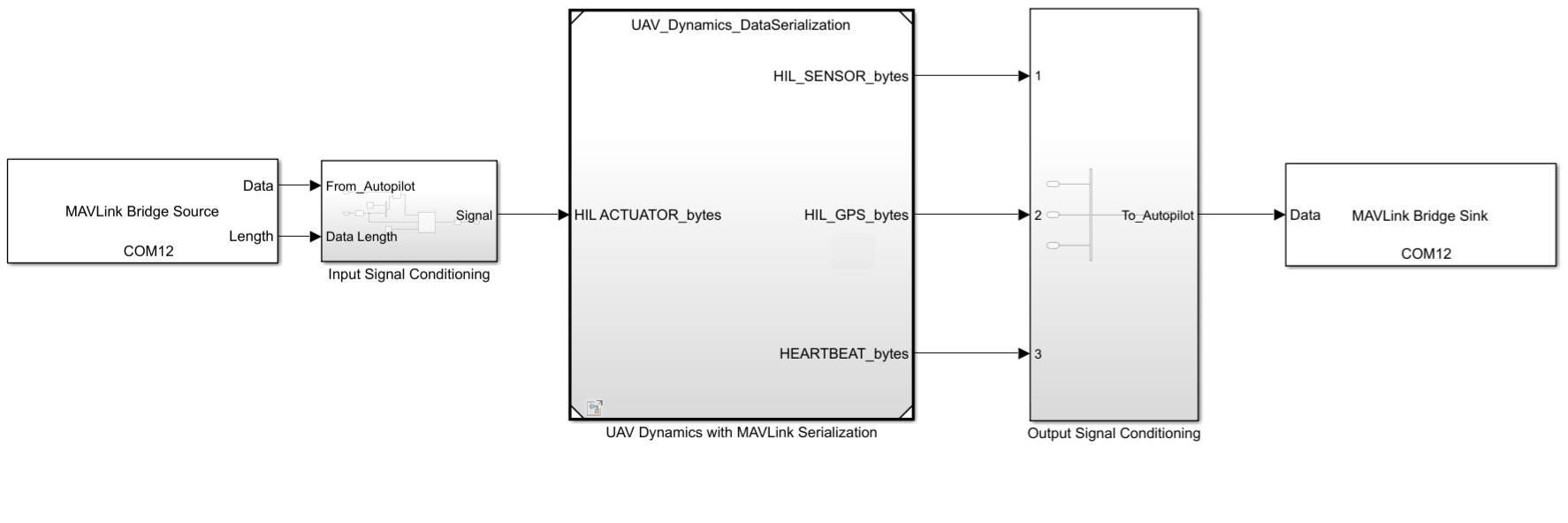 Communication between Simulink and the autopilot is limited to MAVLink® data exchange.