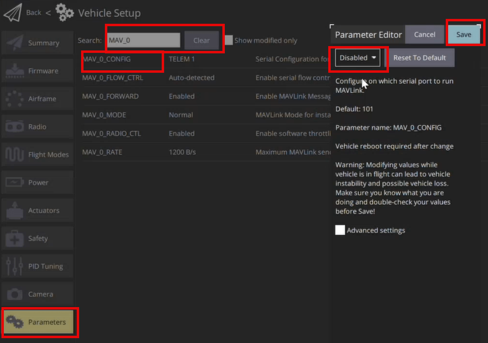 4. Disable MAVLink on TELEM1, TELEM2, or TELEM3 port of the Pixhawk hardware. Check values of the parameters MAV_0_CONFIG and MAV_1_CONFIG to confirm in QGC.