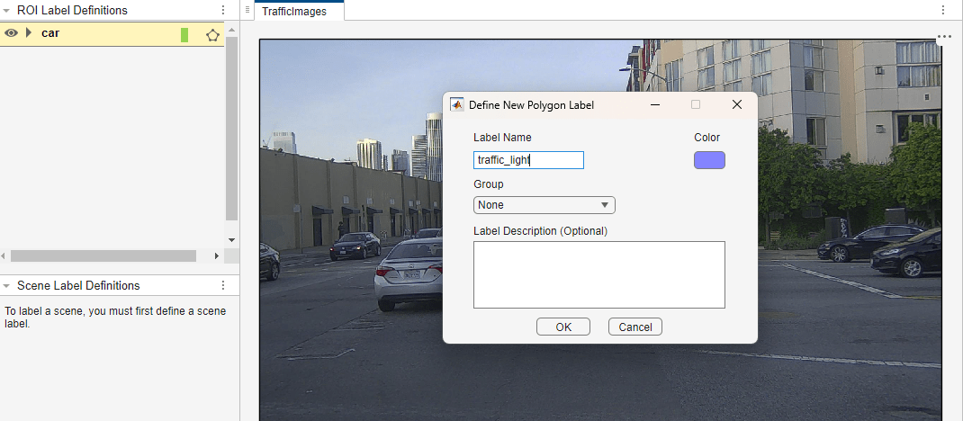3. On the Video Labeler tab of the app toolstrip, in the Label Definition section, click Add Label and select Polygon from the drop down. Define two polygon labels with names car and traffic_light. You can choose a color for each label. Click OK.