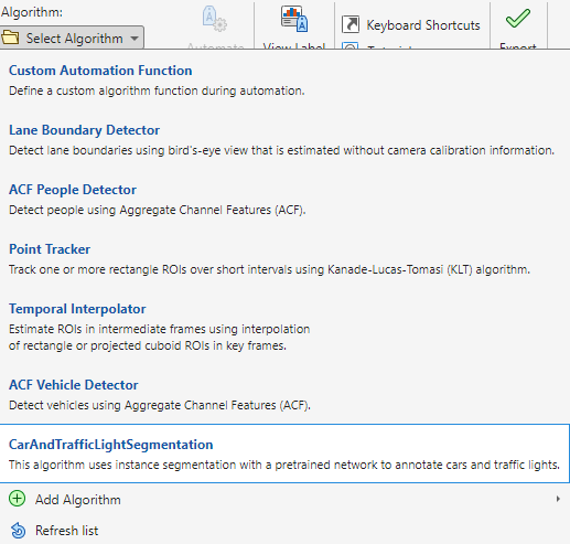 4. On the Video Labeler tab, in the Automate Labeling section, click Select Algorithm > Refresh list.