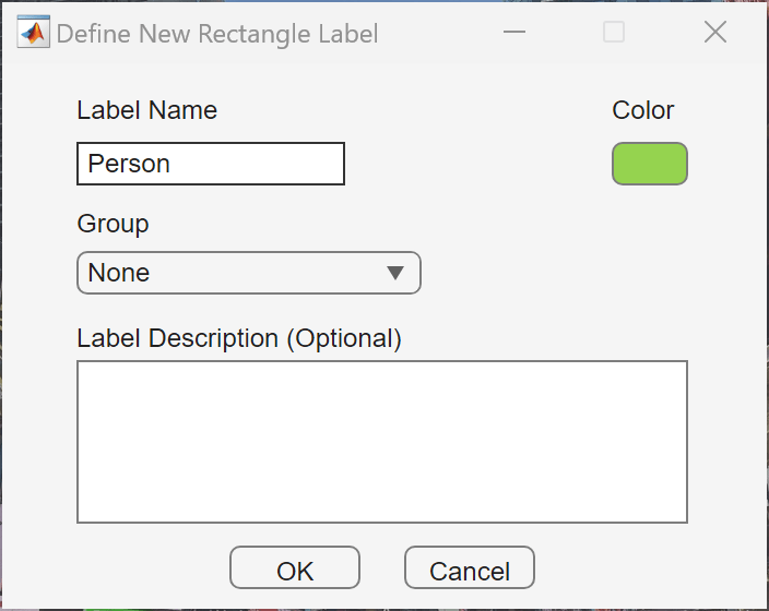 In the Define New Rectangular Label dialog box, specify Label Name as Person. The label name must be a valid MATLAB variable name with no spaces. Select OK to create the new ROI label.