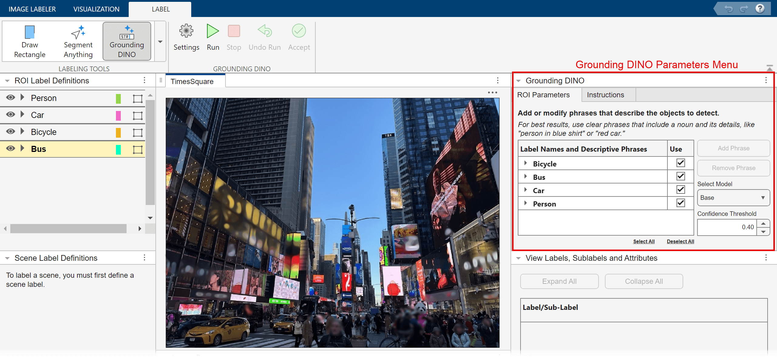 When you are done creating descriptive noun phrases, click the Run in the Grounding DINO section of the app toolstrip to label the specified objects. The Image Labeler app automatically generates rectangle ROI labels for each object, outlining the labeled objects in the color associated with the label. You can view a list of the generated rectangular ROI labels in the View Labels, Sublabels, and Attributes bottom-right panel. The label names are not specific to the descriptive noun phrases.