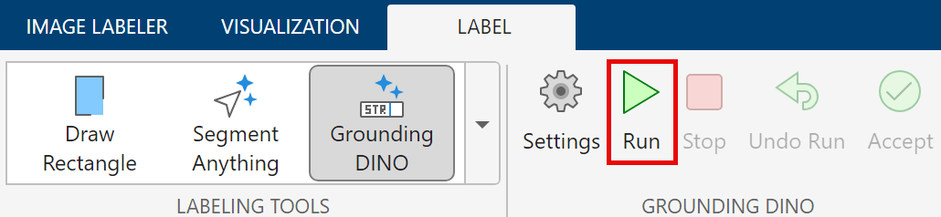 On the Label tab of the app toolstrip in the Labeling Tools section, select Grounding DINO.