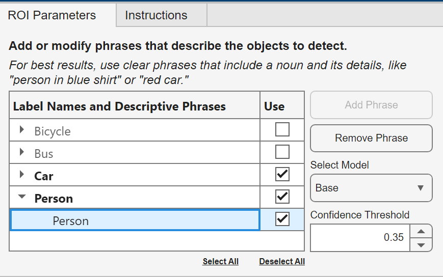 The toolstrip adds a Grounding DINO section, and opens a Grounding DINO tool parameters menu with an interactive ROI Parameters tab on the top-right corner of the app. By default, Image Labeler app creates labels for all existing label definitions. To only label a subset of objects, uncheck the Use checkbox next to the corresponding label name. You can tune the confidence threshold using the Confidence Threshold selector. Increase the confidence threshold to see fewer, more confident detections, or decrease it to detect more objects, including less certain ones. Use the Select Model dropdown menu to select a pretrained Grounding DINO model. Select the Base model for higher accuracy and more robust detections at a higher computational cost. Select the Tiny model when limited computational resources are available.