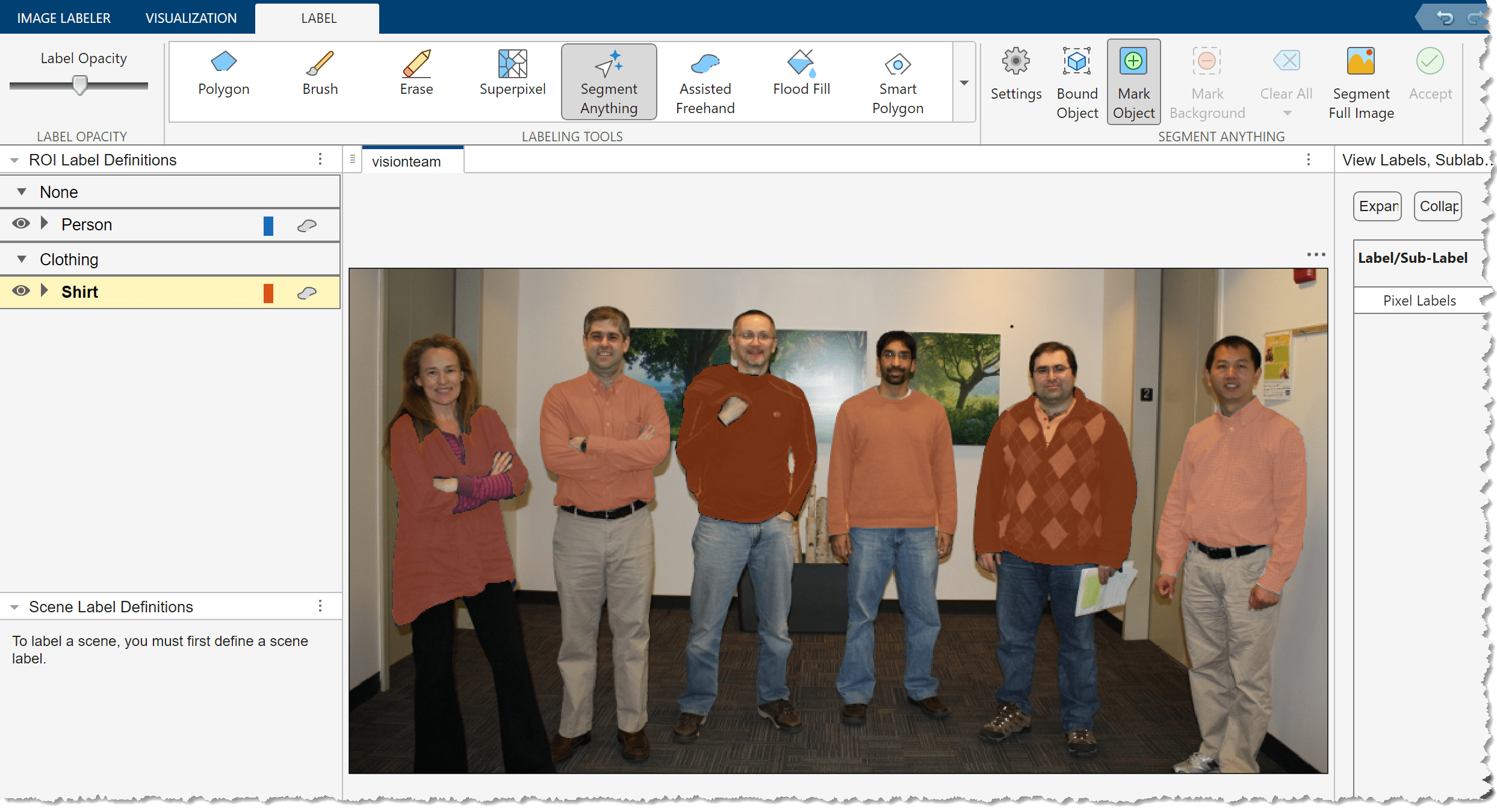 To get started with the Image Labeler app, see Get Started with the Image Labeler. To learn more about the SAM, see Get Started with Segment Anything Model for Image Segmentation.