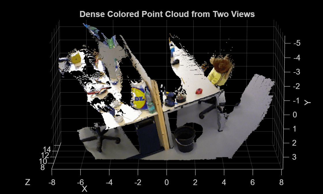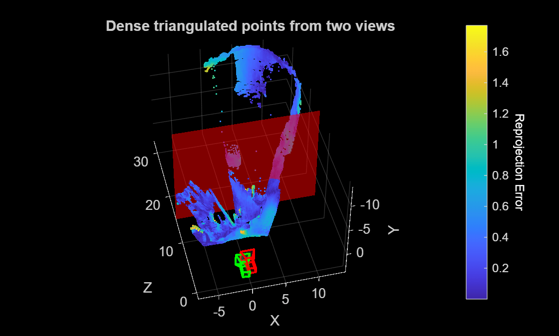 The resulting point cloud provides a dense 3D reconstruction of the scene, up to an unknown scale factor, using two views taken by a calibrated monocular camera. For more information on metric reconstruction of the scene, see Structure from Motion from Two Views.