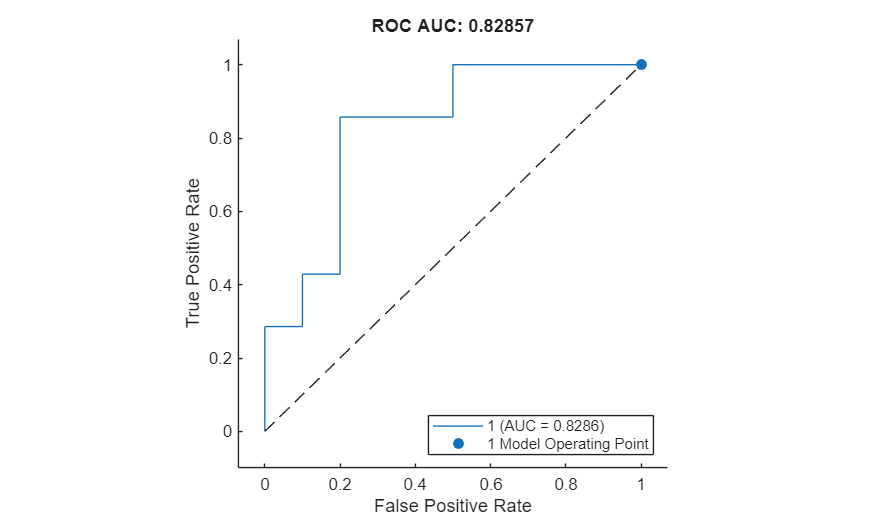 Plot the ROC curve by using the plot function. The ROC curve illustrates the performance of the classifier for a range of possible threshold values. Each point on the ROC curve represents the false positive rate (x-coordinate) and true positive rate (y-coordinate) when you classify the calibration set images using a different threshold value. The solid blue line represents the ROC curve. The area under the ROC curve (AUC) metric indicates classifier performance, with a perfect classifier corresponding to the maximum ROC AUC of 1.