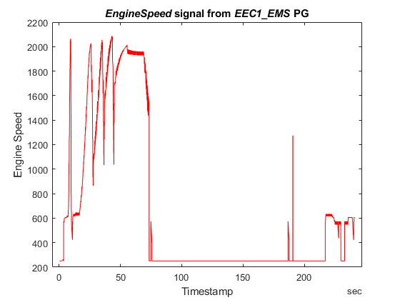 plot(signalTimetable1.Time, signalTimetable1.EngSpeed, "r") title("{\itEngineSpeed} signal from {\itEEC1\_EMS} PG", "FontWeight", "bold") xlabel("Timestamp") ylabel("Engine Speed")