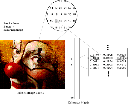 A typical color image requires two matrices: a colormap and an image matrix. The colormap is an ordered set of values that represent the colors in the image. For each image pixel, the image matrix contains a corresponding index into the colormap. (The elements of the image matrix are floating-point integers, or flints, which MATLAB stores as double-precision values.)