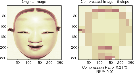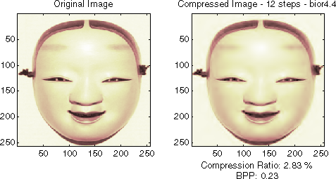 Starting from the eleventh loop, the result can be considered satisfactory. The reached BPP ratio is now about 0.35. It can even be slightly improved by using a more recent method: SPIHT (Set Partitioning In Hierarchical Trees).