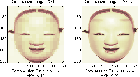 A too small number of steps (here 6) produces a very coarse compressed image. So let us examine a little better result for 9 steps and a satisfactory result for 12 steps.
