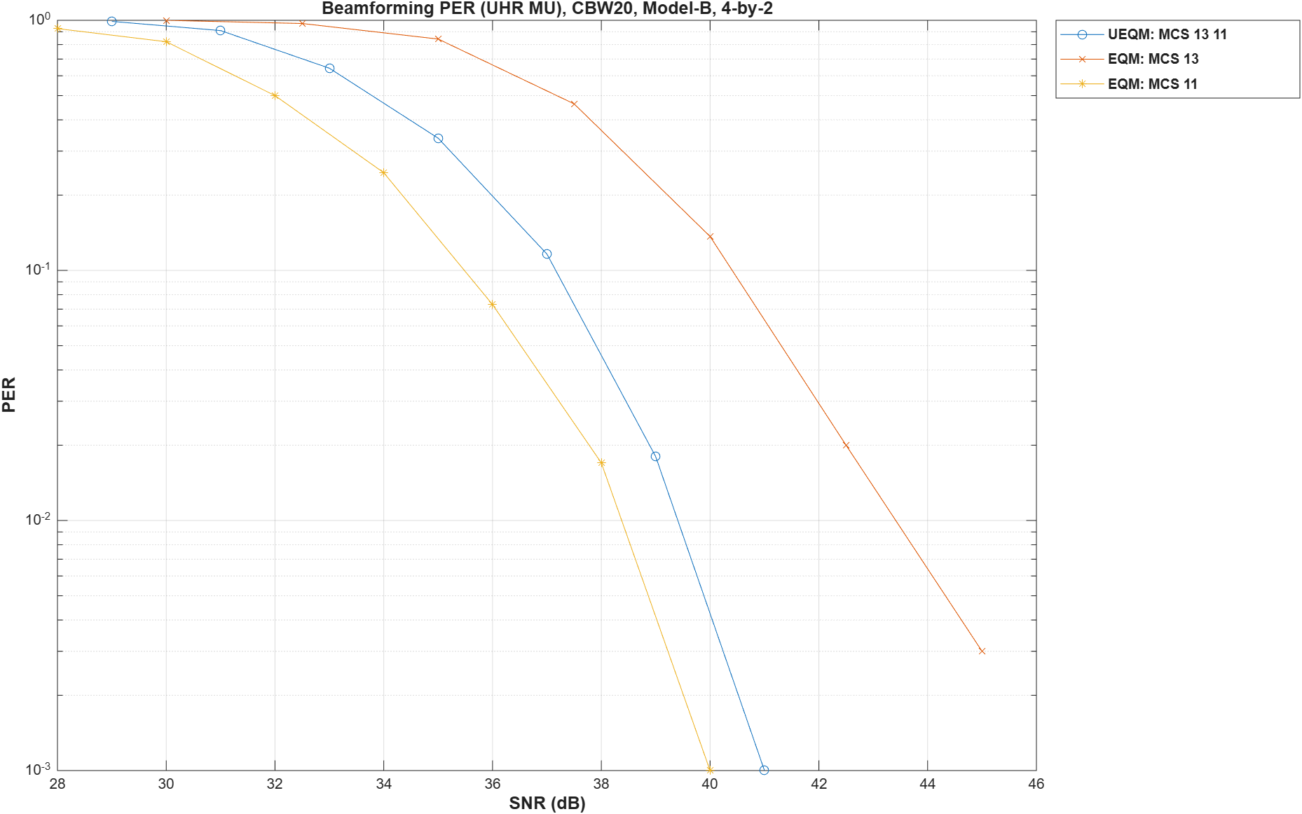 title(['PER (UHR MU), ' num2str(cfgUHRBase.ChannelBandwidth) ', Model-B, ' num2str(NumTxAnts) '-by-' num2str(NumRxAnts)]);